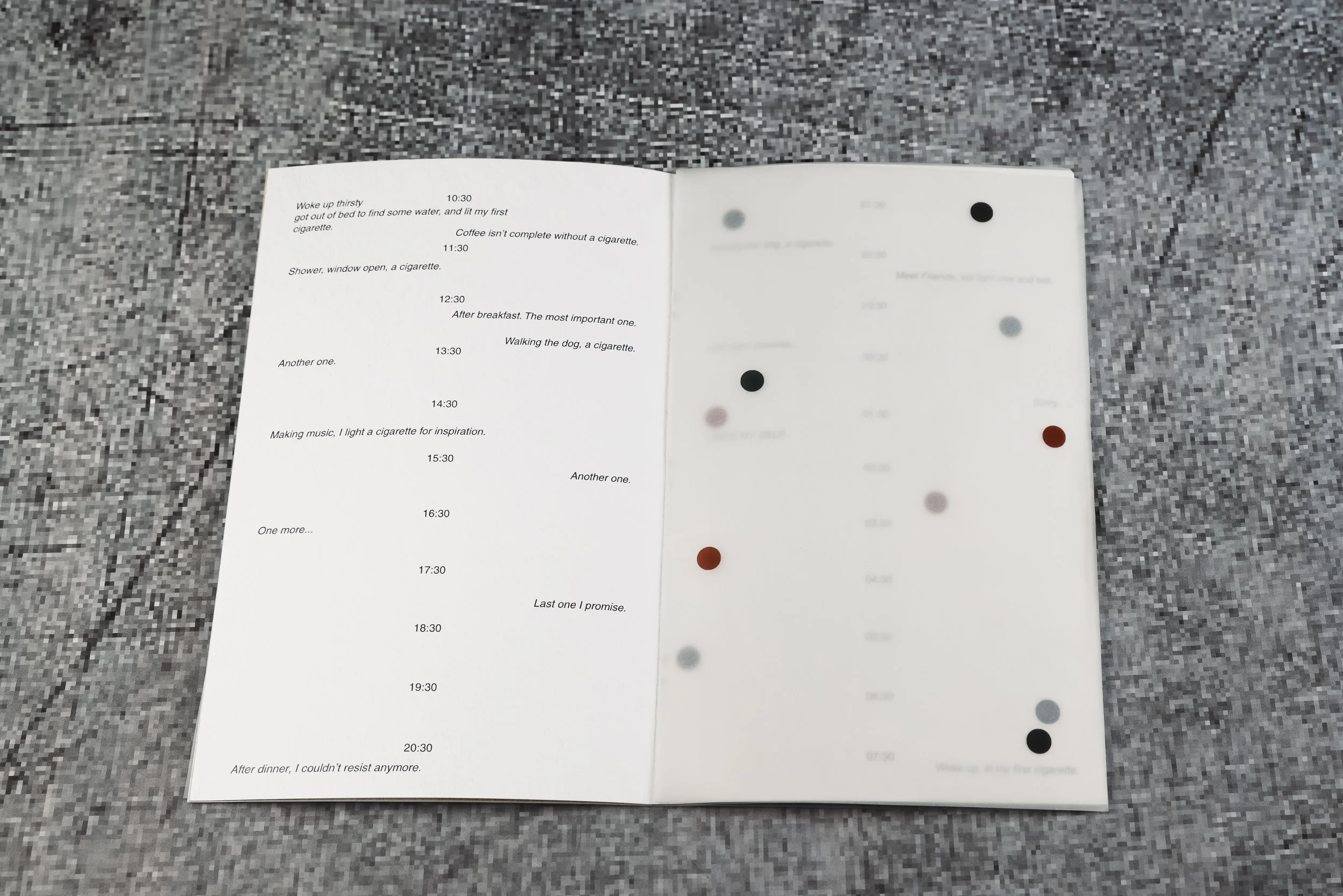 If the book records the more negative emotions, then the cigarette box represents the joy and the moments of beauty that smoking brings me. I often use my camera to capture small, interesting moments.